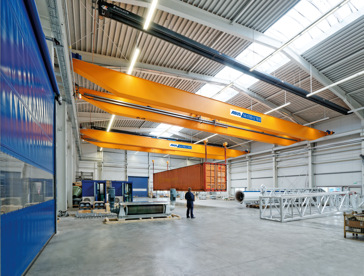 ABUS Zweiträgerlaufkrane sind mit Spannweiten bis zu 42 m realisierbar und bieten die besten Voraussetzungen bei zusätzlichen Anforderungen, wie zum Beispiel höhere Kranfahrgeschwindigkeit, die Installation von Wartungslaufbühnen, begehbare Laufkatzen oder Hilfshubwerke.